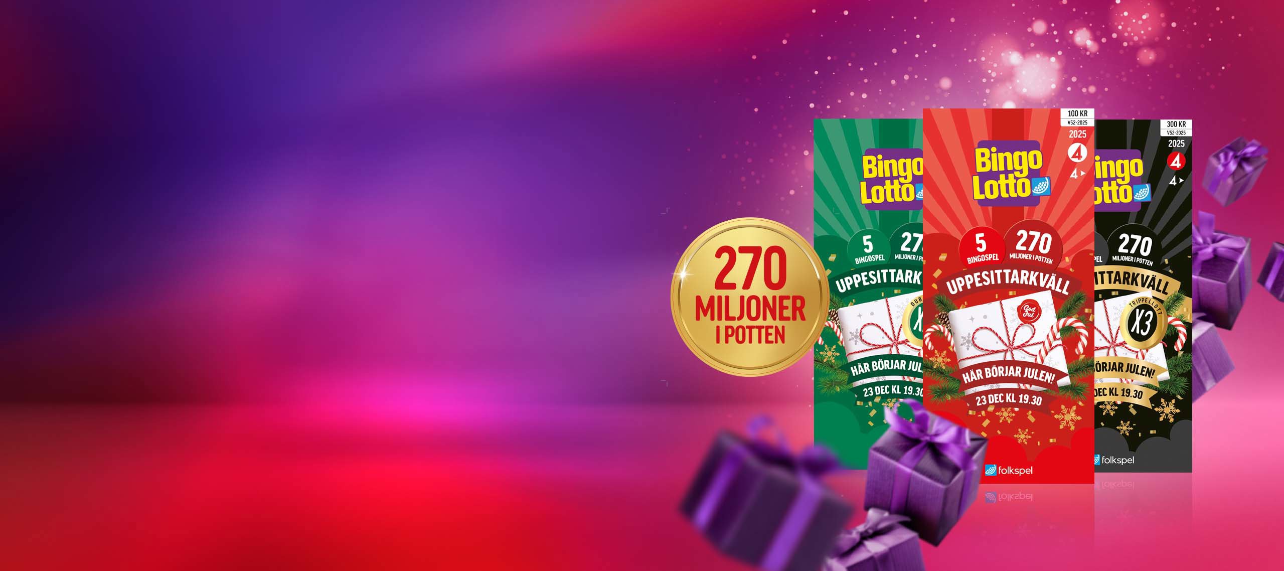 Välkommen till Sveriges största Nyårsfest där vi håller dig sällskap hela vägen över tolvslaget! Vi bjuder på fyra bingospel, Nyårslotto och mycket mer. Vi ses på TV4 och TV4 Play 31 december med start 20.00!