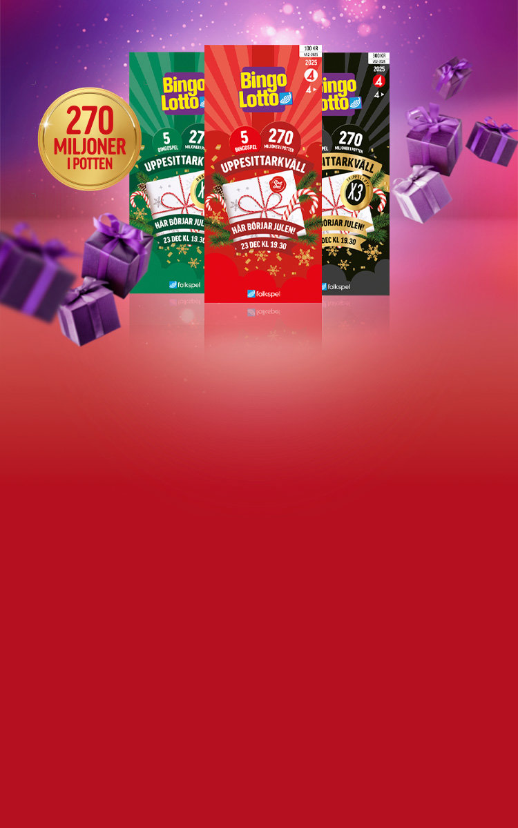 BingoLottos Uppesittarkväll bjuder på 5 bingospel, miljoner i potten och sänds i TV4 och på TV4 Play, kl. 19.30 den 23 december varje år!