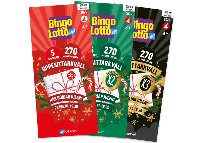 Här hittar du dina digitala bingolotter till kommande program. Välj mellan den ordinarie bingolotten (X1), eller testa lyckan lite extra med BingoLotto X2 eller BingoLotto X3 som vi bl.a erbjuder till Uppesittaren och Nyårsbingot. Bingolotto X2 dubblar alla dina vinster och BingoLotto X3 TRIPPLAR dina vinster!