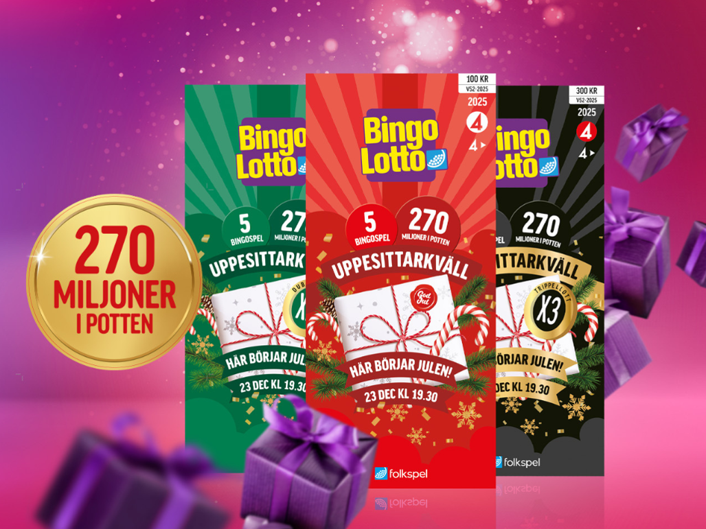 Missa inte årets höjdpunkt! BingoLottos Uppesittarkväll bjuder på 5 bingospel, miljoner i potten och sänds i TV4 och på TV4 Play, kl. 19.30 den 23 december!