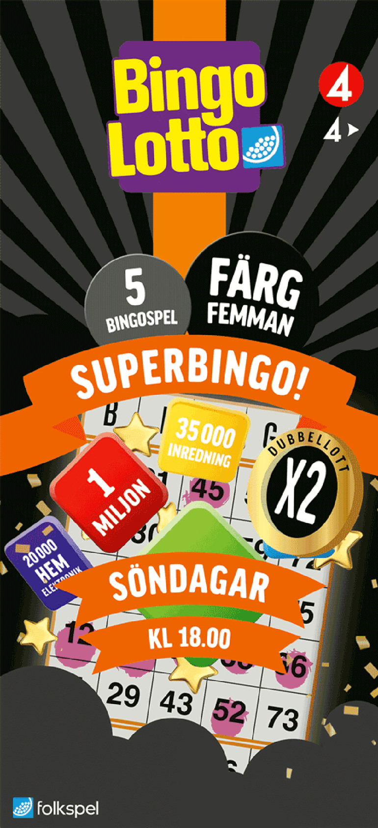 Bingolottos eventomgångar är Superbingo, Uppesittarkvällen, NyårsBingo, Påskbingo och MidsommarBingo. Lottpriset för en dubbellott (X2) på våra eventomgångar är 200 kronor styck. Antalet eventomgångar kan variera per månad vilket också påverkar månadskostnaden. I december har BingoLotto två eventomgångar.