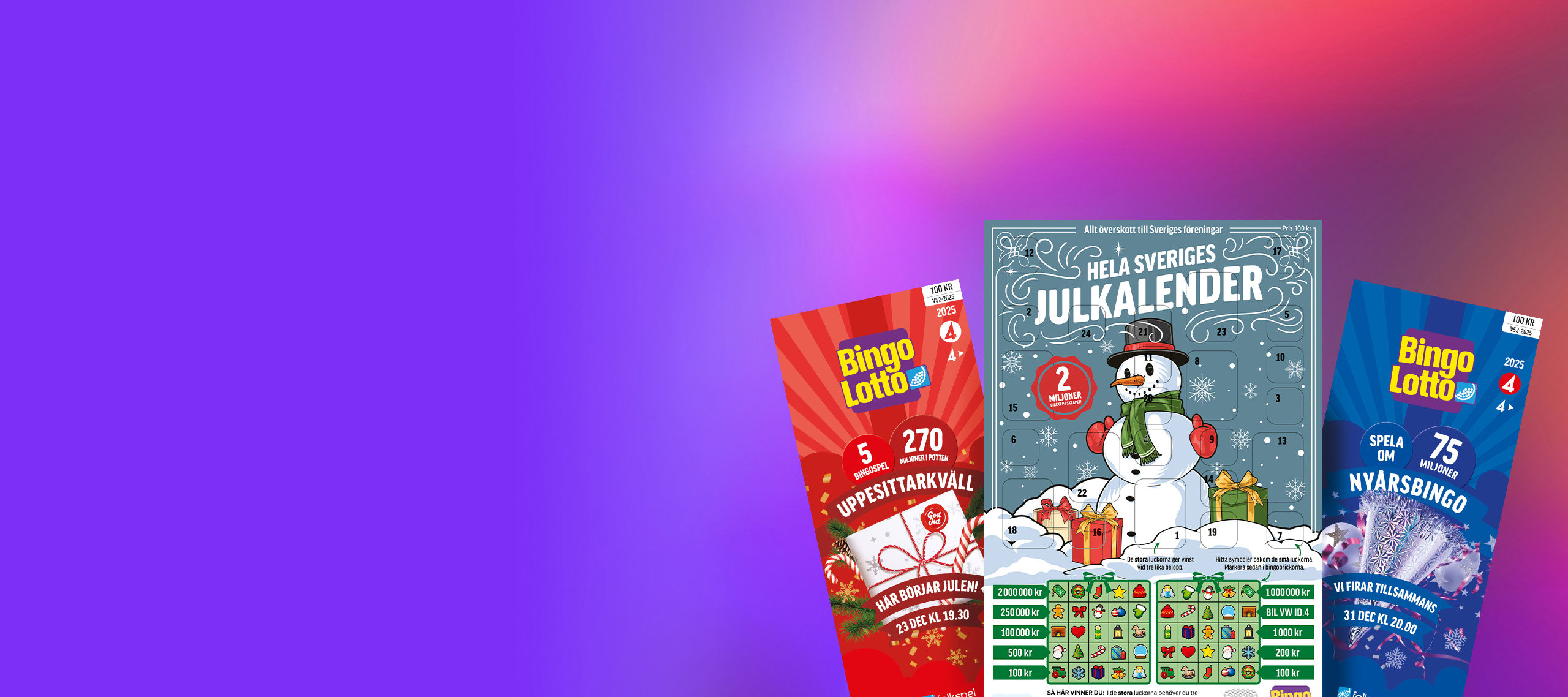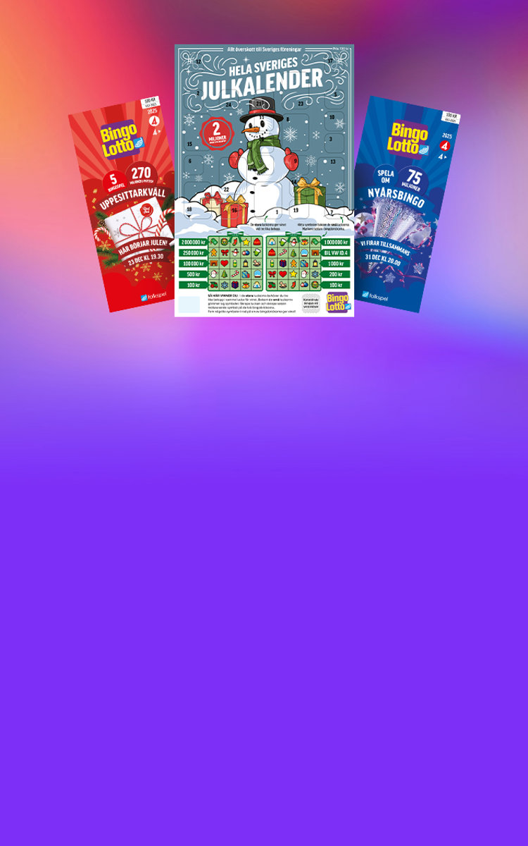 Starta en prenumeration på Bingopaketet och få tre extra lotter: 1 Julkalender, 1 lott till Uppesittarkvällen och 1 Nyårslott (värde 300 kr). Bindningstid 8 veckor. ✔️ Nya lotter varje vecka ✔️ Avsluta när du vill efter bindningstiden Erbjudandet gäller under en begränsad tid – passa på!