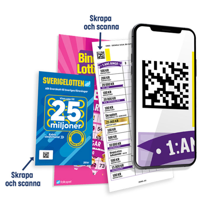 Använd kameran i din mobil eller på din dator och skanna kontrollrutan på lotten – så får du dina vinster direkt på ditt Folkspelskonto.